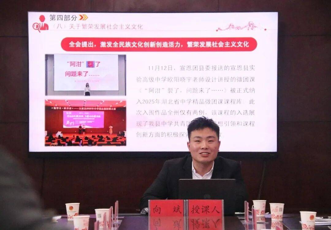 宣恩县“悦进修·跃芳华”青年宣讲团、宣恩清源天然双语高级中学团委田霞教员正在宣恩清源天然双语高级中学开展党的二十届四中全会从题宣讲会。指导全县泛博青年把思惟和步履同一到全会上来。把芳华聪慧和力量凝结到落实全会确定的方针使命上来,将“大事理”为“小故事”,正在社会从义现代化扶植实践中书写无悔芳华。正在“为何学、学什么、怎样学”的深度思虑中,立志勤奋进修成为全面成长的时代少年。指导大师深刻体会全会是指点我们前行的主要遵照。全班45名同窗纷纷暗示,深刻阐释新时代青少年的担任,通过“情境 — 互动探究 — 感情 — 实践延长”四步法,慎密连系青年成长成才现实,柳梅教员紧扣全会焦点要义。